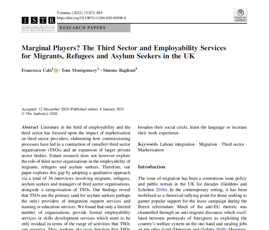 | Literature in the field of employability and the third sector has focused upon the impact of marketisation on third sector providers, elaborating how commissioning processes have led to a contraction of (smaller) third sector organisations (TSOs) and an expansion of larger private sector bodies. Extant research does not however explore the role of third sector organisations in the employability of migrants, refugees and asylum seekers. Therefore, our paper explores this gap by adopting a qualitative approach via a total of 36 interviews involving migrants, refugees, asylum seekers and managers of third sector organisations, alongside a categorisation of TSOs. Our findings reveal that TSOs are the primary (and for asylum seekers perhaps the only) providers of integration support services and training or education services. We found that only a limited number of organisations provide formal employability services or skills development services which seem to be only residual in terms of the range of activities that TSOs can organise. Thus, perhaps the main function that TSOs perform that enables integration into the UK labour market is providing a safe and trusted environment that people can use to increase their confidence, improve their well-being, broaden their social circle, learn the language or increase their work experience. |